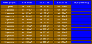 Zoals u kan zien, betaald U feitelijk voor het aantal groepen dat u nodig heeft. Bepaal de hart afstand van uw keuze en bepaal dan in de tabel de oppervlakte. U kunt dan aflezen het aantal groepen dat U nodig heeft.